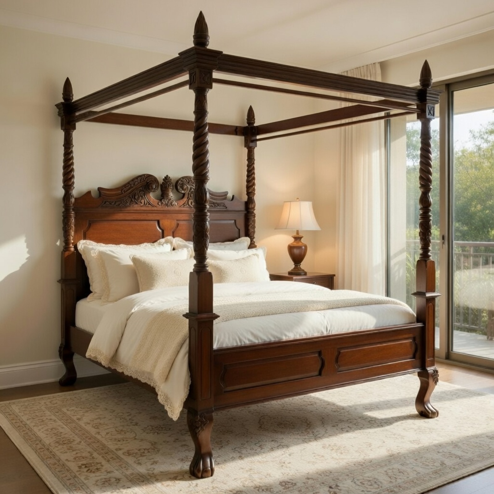The Classic Mahogany Four Poster Bed is hand carved and finished in solid wood. This is a truly outstanding and imposing bed. Bring a classical look to your bedroom with this fabulous super king size bed. It is supplied complete with slats and is fully dismantled so it will go up all stair cases. Some minor DIY skills are recommended to assemble this beautiful piece of furniture.