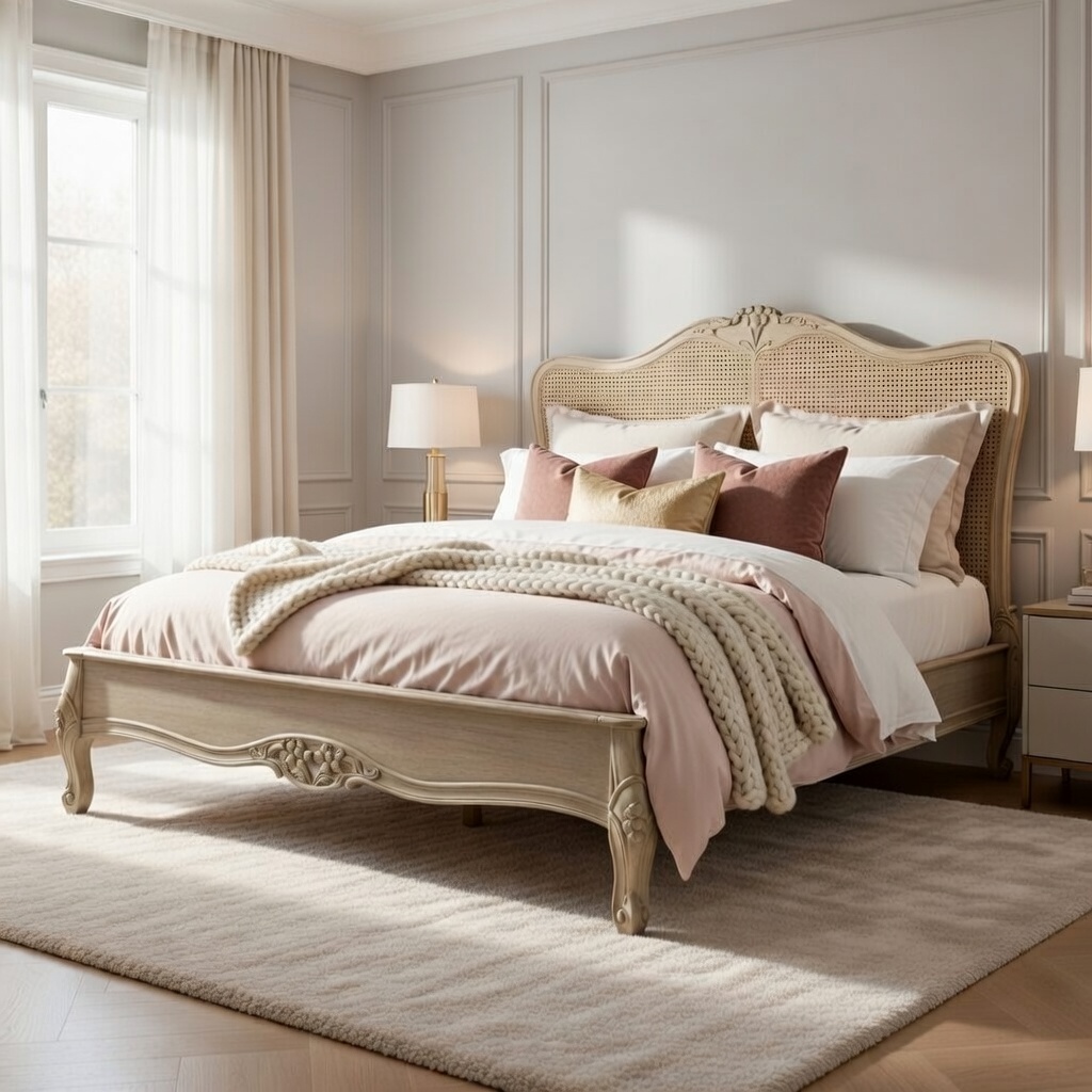 Loire Weathered Finish French Bed with no / low foot board. Made in hand carved mahogany and sealed with a white glaze that transforms the texture of the wood. Expect to see imperfections in the finish because this is all part of the charm and beauty of this lovely bed. The headboard is made with double layer rattan and the bed is supplied with a slatted base.